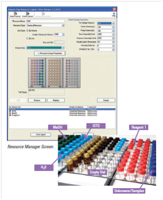 Resurs menejeri ekrani rang-kodli grafik interfeys yordamida resurslarni osongina aniqlash va erituvchilar, reagentlar, standartlar, bo'sh naychalar va boshqa muhim sarf materiallaridagi o'zgarishlarni kuzatish imkonini beradi. Dastur shuningdek, kimyoviy darajalarni nazorat qilish imkonini beradi va to'ldirish kerak bo'lganda avtomatik ravishda sizga xabar beradi.